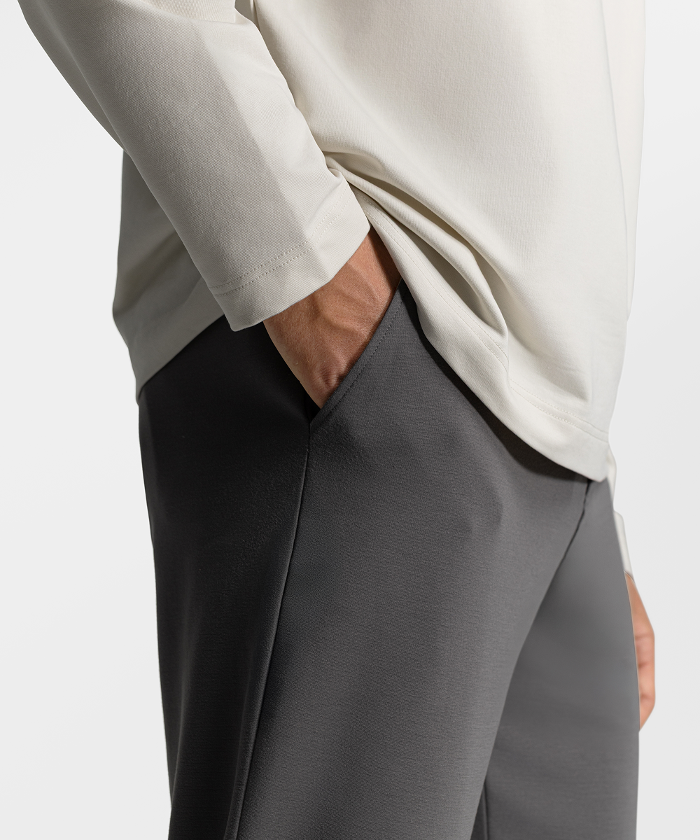 New and even better. Trousers with a sleek, professional appearance and the comfort of sweatpants. Refined in the details you don’t immediately see, but definitely feel—construction, stretch, finish. Woven to perfection in rich Punti Di Roma, a structured knit with subtle give. Soft to the touch, quietly resilient. Now available in multiple waist and length sizes for a sharper fit and more refined silhouette, tailored to feel just right.