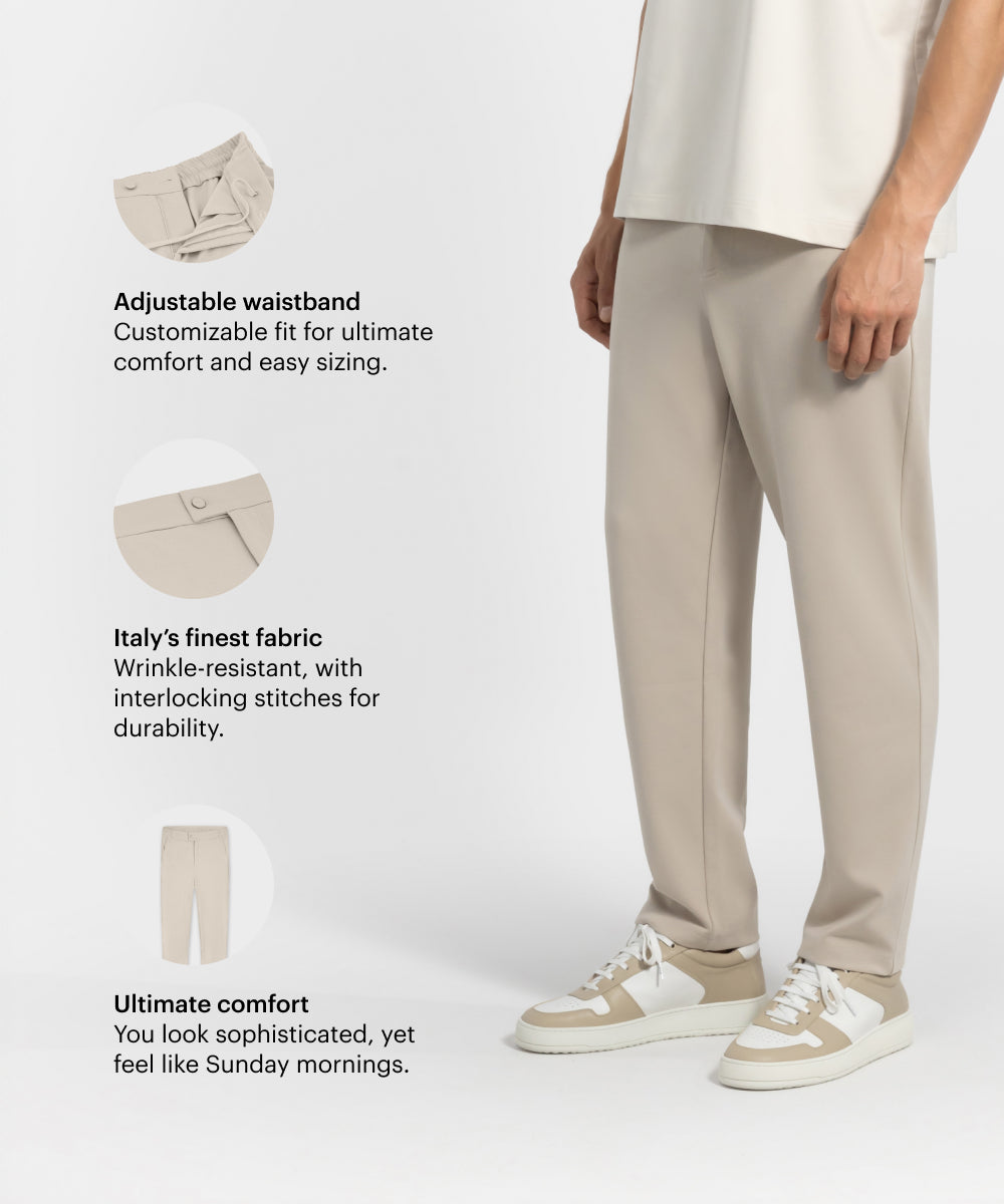 New and even better. Trousers with a sleek, professional appearance and the comfort of sweatpants. Refined in the details you don’t immediately see, but definitely feel—construction, stretch, finish. Woven to perfection in rich Punti Di Roma, a structured knit with subtle give. Soft to the touch, quietly resilient. Now available in multiple waist and length sizes for a sharper fit and more refined silhouette, tailored to feel just right.